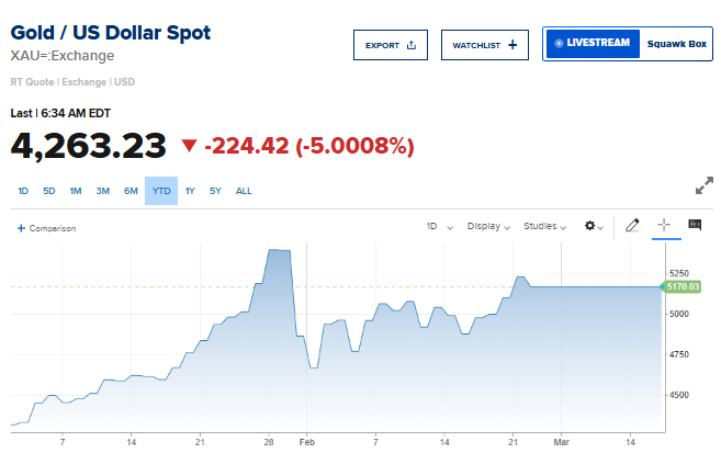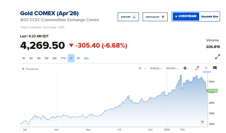كما تراجعت العقود الآجلة للذهب بنحو 6.6% إلى 4269.50 دولار، وهو أدنى مستوى يتم تسجيله منذ بداية عام 2026.