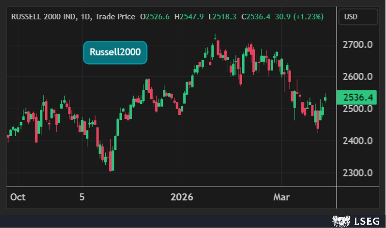 وقفز مؤشر Russell 2000 للشركات الصغيرة بنسبة 1.2% مسجلاً ثالث مكاسب يومية على التوالي ليغلق عند أعلى مستوياته في أسبوعين.