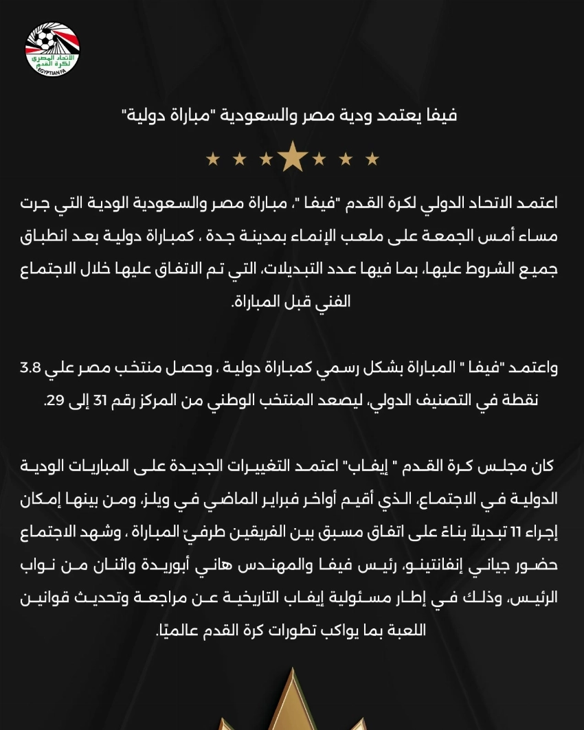 وقال الاتحاد المصري في بيان رسمي: إن مواجهة مصر والسعودية تم اعتمادها كـ«مباراة دولية» من قبل الاتحاد الدولي لكرة القدم (فيفا)، بعد انطباق جميع الشروط عليها، بما في ذلك عدد التبديلات التي تم الاتفاق عليها خلال الاجتماع الفني قبل المباراة.