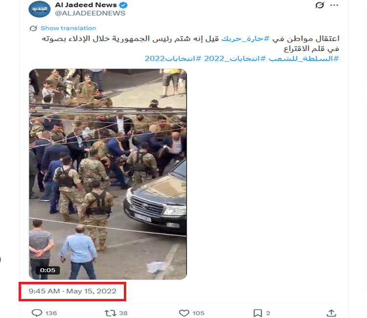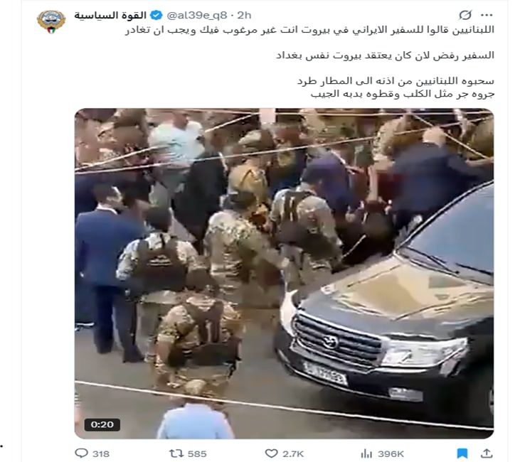 حصد الفيديو 400 ألف مشاهدة على الأقل في منصة إكس وحدها، مصحوبًا بوصف مُضلل يقول: "اللبنانيون قالوا للسفير الإيراني في بيروت أنت غير مرغوب فيك ويجب أن تغادر. السفير رفض لأنه كان يعتقد بيروت نفس بغداد. سحبوه اللبنانيين من أذنه إلى المطار طُرد، جروه جر مثل الكلب وقطوه بدبة الجيب".