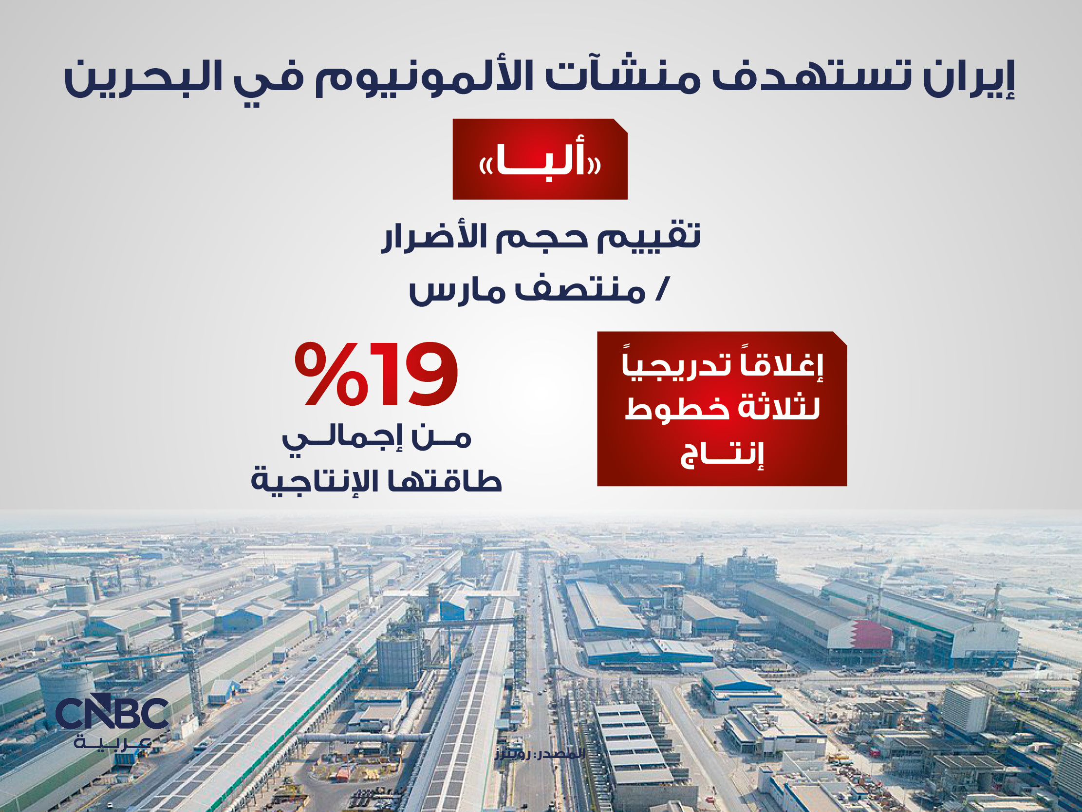 لكن شركة الإمارات العالمية للألمنيوم قالت يوم السبت إن مصنعها في الطويلة بأبوظبي الذي ينتج حوالي 1.5 مليون طن متري سنوياً، أصيب بأضرار جسيمة جراء هجمات إيرانية. وقالت شركة ألمنيوم البحرين إن مصنعها الذي ينتج 1.6 مليون طن سنوياً أصيب في هجوم في نفس اليوم.