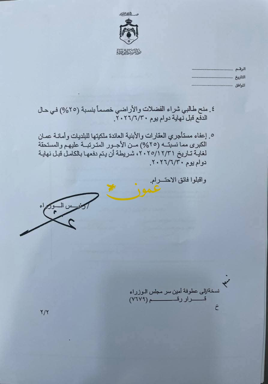 1- منح خصم على ضريبة الأبنية والأراضي (المسقفات وضريبة المعارف ورسوم مساهمة الصرف الصحي للسنوات السابقة وعام ٢٠٢٥ المفروضة على الأراضي والعقارات داخل حدود البلديات وأمانة عمان الكبرى بنسبة.....