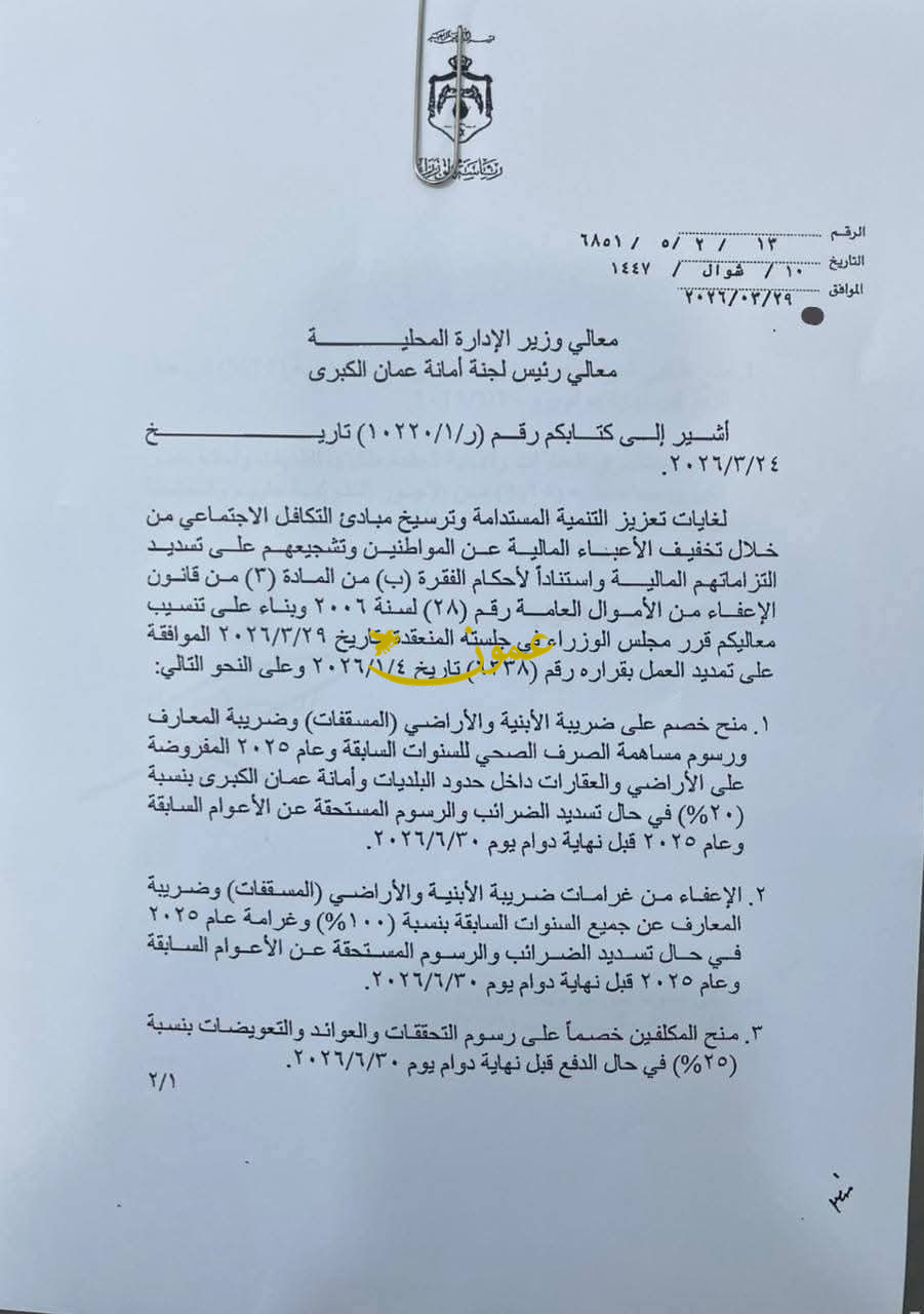 عمون - وجه رئيس الوزراء الدكتور جعفر حسان، كتابا إلى وزير الإدارة المحلية ورئيس لجنة أمانة عمان الكبرى، يبلغهما فيه بتمديد قرار مجلس الوزراء القاضي منح خصومات على ضريبة الأبنية والأراضي ورسوم التحققات والعوائد وشراء الفضلات، والاعفاء من الغرامات، شريطة الدفع قبل نهاية يوم 30-6-2026.