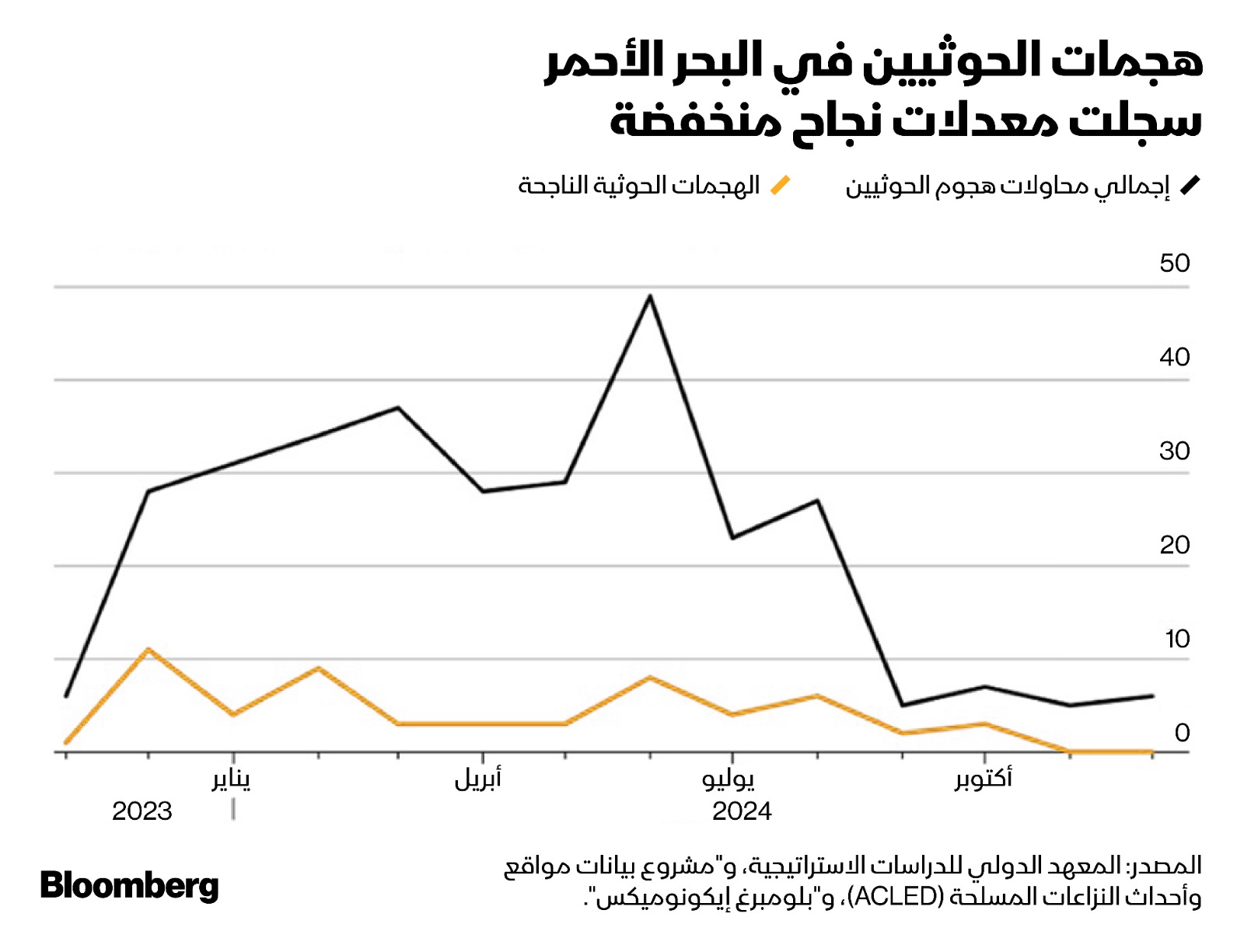 تتوقع "بلومبرغ إيكونوميكس"، في تقرير أعدّه المحللون دينا إسفندياري، وزياد داوود، وبيكا واسر، أن يصعّد الحوثيون الهجمات، إذا اتخذت الولايات المتحدة خطوة تشكل تصعيداً كبيراً -بما في ذلك عملية برية في إيران- بحيث يستهدفون الشحن في البحر الأحمر.