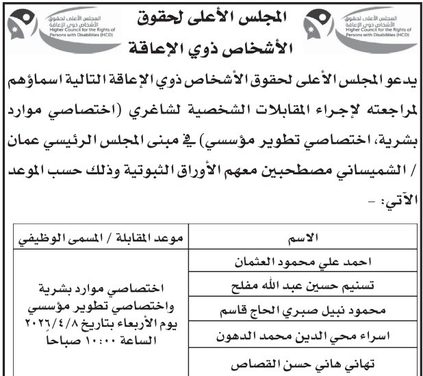 الوكيل الإخباري- دعت المجلس الاعلى لحقوق الأشخاص ذوي الإعاقة، اليوم الخميس التالية أسماؤهم لإجراء المقابلات الشخصية.
