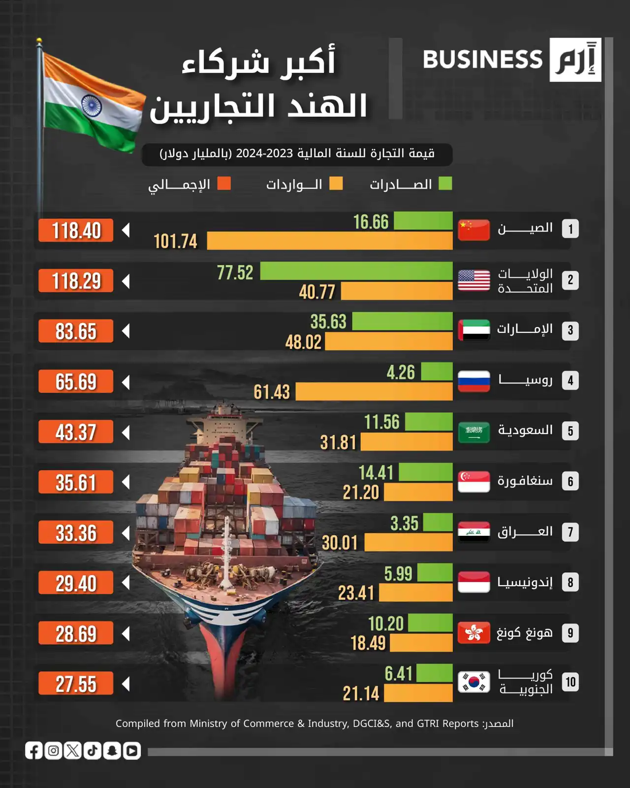 البيانات وفق وزارة التجارة والصناعة الهندية وتقارير DGCI&S وGTRI.
