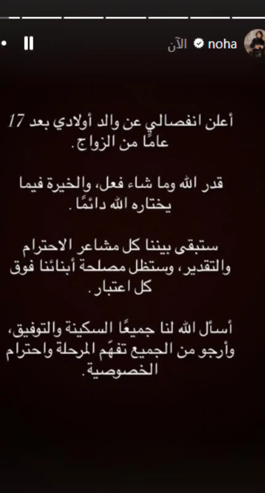وفضلت نهى الاكتفا ءبهذا البيان دون التطرق لتفاصيل وأسباب الطلاق تماشيًا مع طلبها احترام خصوصيتها، إذ اختتمت المنشور قائلة: أسأل الله لنا جميعاً السكينة.....