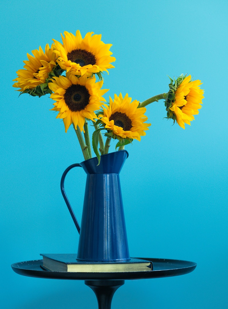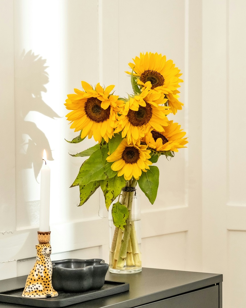لعل أفضل طريقة لإبراز جمال زهور عباد الشمس هي تركها منفردة، حتى تشيع لمسة جريئة ومشرقة تُنير أي غرفة. في هذا الإطار، ركزي على التنويع في أطوال السيقان لجاذبية مؤكدة.