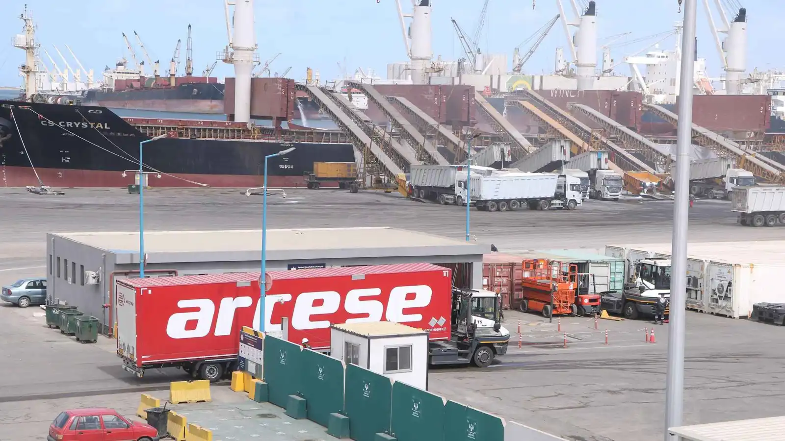 شاحنات وسفن راسية في ميناء دمياط المصري.