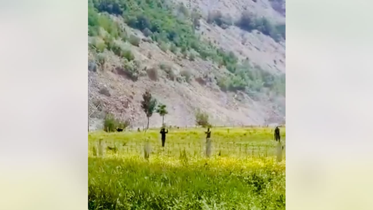 يُظهر المقطع القصير، البالغة مدته 6 ثوان، شخصًا يُصوّب سلاحه نحو شخص آخر يرفع يديه في حقل كبير.