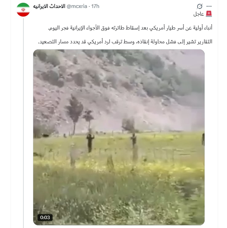 وزعم ناشرو الفيديو أنه جرى "أسر طيار أمريكي بعد إسقاط طائرته فوق الأجواء الإيرانية فجر اليوم"، وأن "التقارير تشير إلى فشل محاولة إنقاذه، وسط ترقب لرد أمريكي قد يحدد مسار التصعيد".