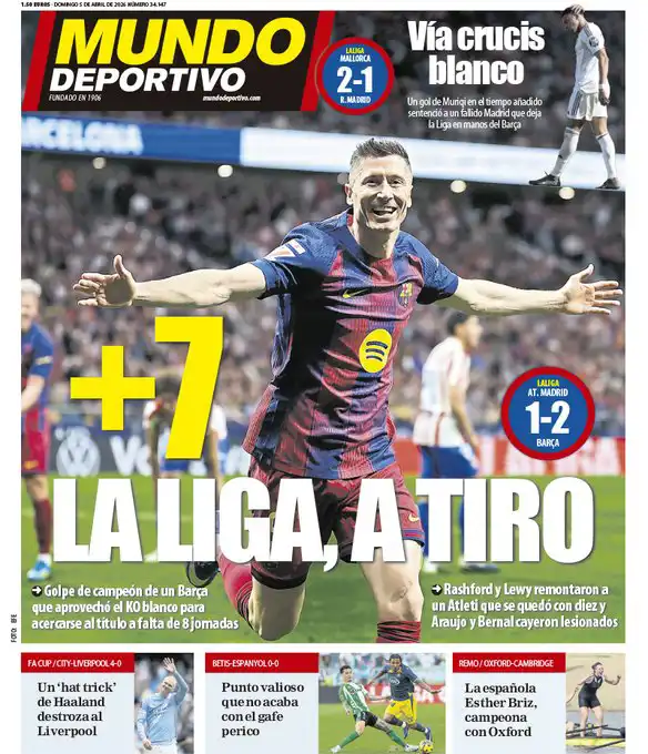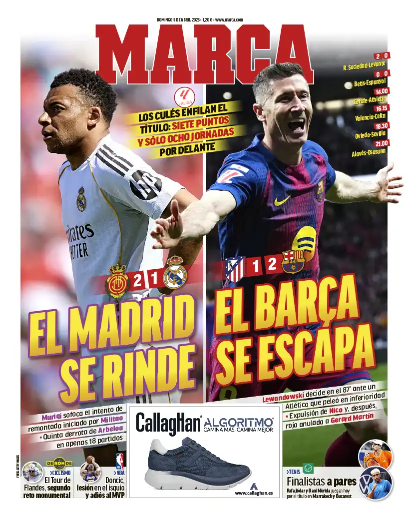 ركزت الصحيفة على هزيمة ريال مدريد أمام ريال مايوركا 2-1، وفوز برشلونة على أتلتيكو مدريد 2-1 في الدوري الإسباني، وكتبت: "ريال مدريد يستسلم.. برشلونة يوسع الفارق".