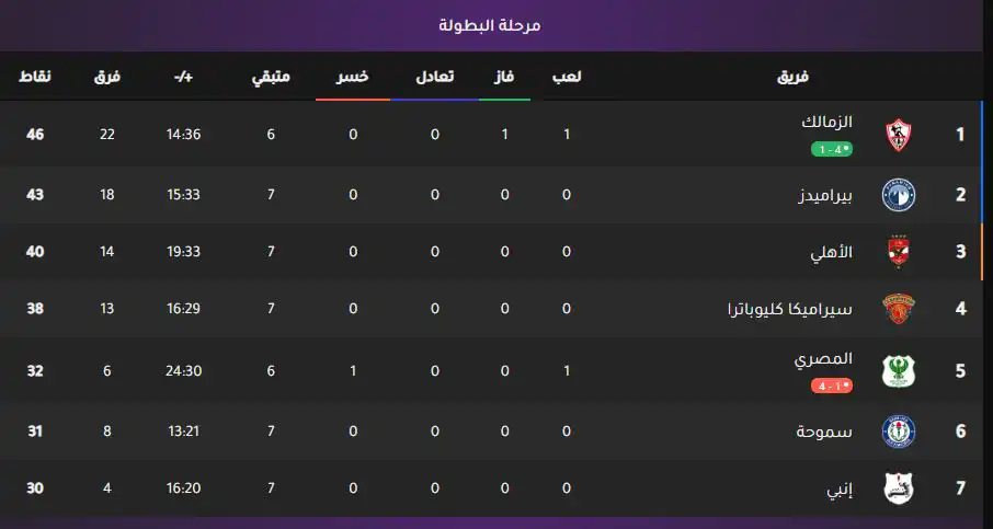 ترتيب الدوري المصري بعد اكتساح الزمالك للمصري البورسعيدي