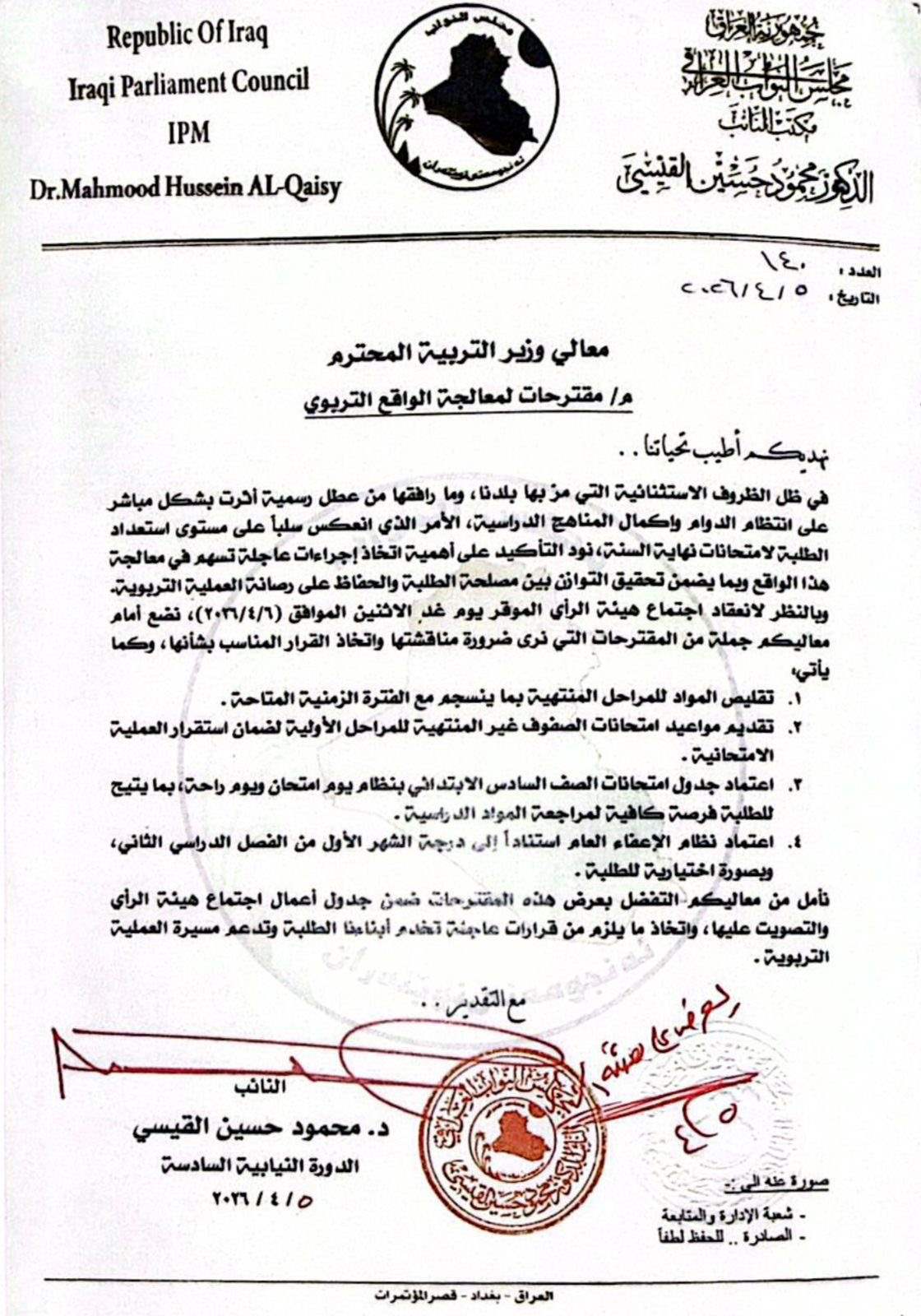 أعلن رئيس كتلة عزم النيابية، السومرية نيوز أعلن رئيس كتلة عزم النيابية، محمود القيسي اليوم الاثنين، حصوله على موافقة وزير التربية لعرض مجموعة من الحلول العاجلة أمام هيئة الرأي في وزارة التربية بهدف معالجة الواقع التربوي وتعزيز استقرار العملية التعليمية. وتضمنت المقترحات المقدمة أربع نقاط أساسية، شملت تقليص المواد الدراسية للمراحل المنتهية بما يتناسب مع الفترة الزمنية المتاحة، إضافة إلى تقديم مواعيد امتحانات الصفوف غير المنتهية للمراحل الأولية، لضمان تنظيم أفضل للعملية.....