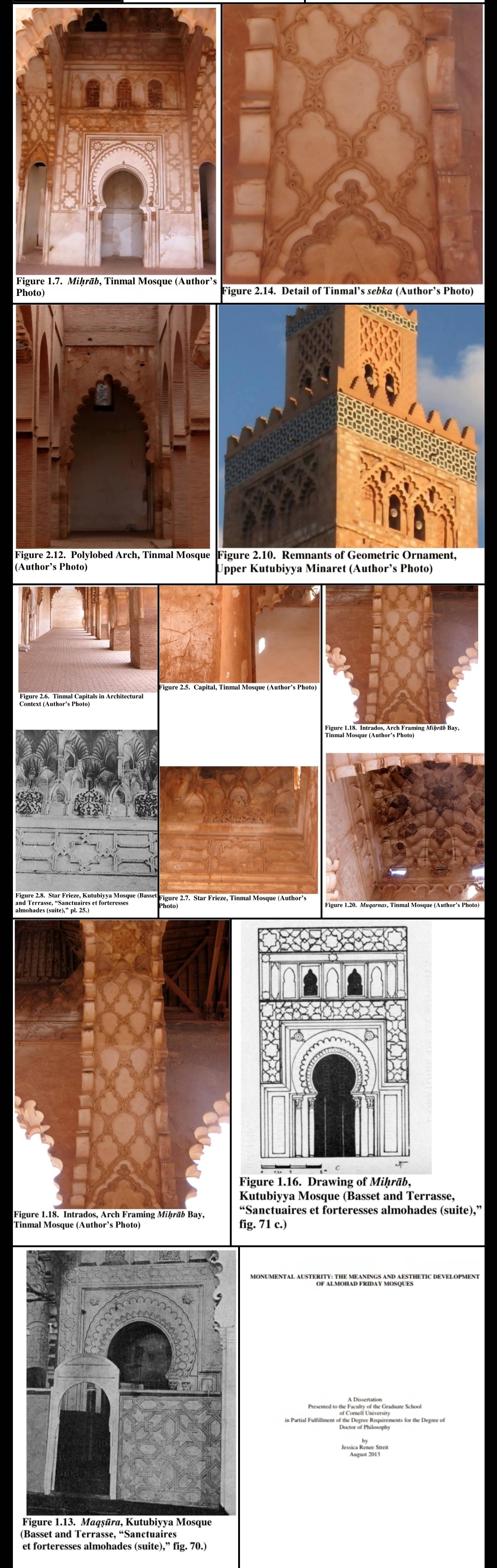 وتخصص الباحثة المبحث الممتد من الصفحة 59 إلى 64 لتحليل مسجد تينمل بصفته المنطلق الأول للرسالة المعمارية الموحدية.