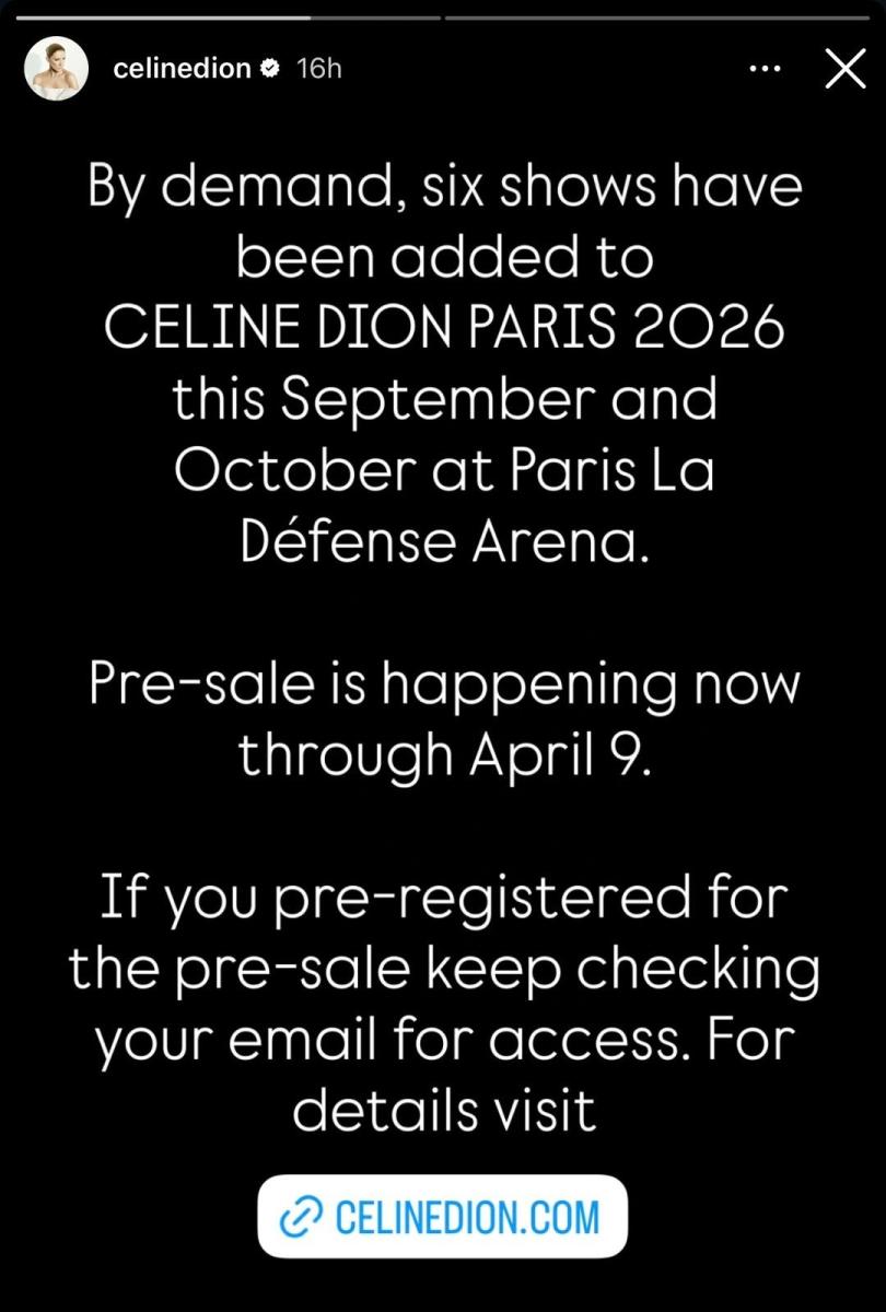 وأكدت ديون في فيديو نشرته عبر حسابها الرسمي على إنستغرام أنها ستُحيي حفلتين أسبوعياً في العاصمة الفرنسية باريس، وذلك ابتداءً من 12 سبتمبر وحتى 14 أكتوبر 2026، على مسرح "باريس لا ديفانس أرينا" الذي يتسع لنحو 40 ألف متفرج.