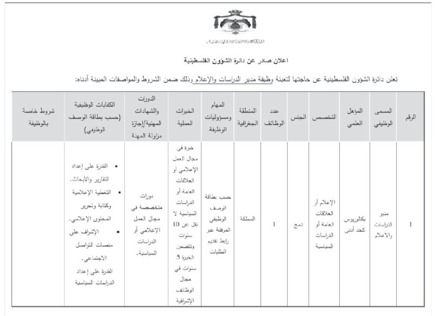 الوكيل الإخباري- اعلنت دائرة الشؤون الفلسطينية اليوم الخميس عن حاجتها لتعبئة وظائف شاغرة.