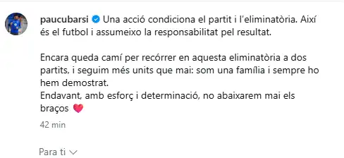 وجه باو كوبارسي، مدافع برشلونة الإسباني، رسالة مهمة بعد ساعات من خسارة فريقه على يد ضيفه أتلتيكو مدريد الإسباني بنتيجة 0-2 مساء أمس الأربعاء في جولة الذهاب بدور ربع النهائي ببطولة دوري أبطال أوروبا.