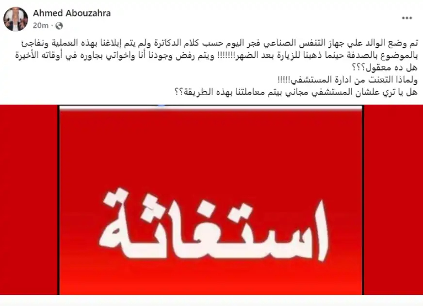 استغاثة نجل عبد الرحمن أبو زهرة وجّه أحمد أبو زهرة استغاثة عبر حسابه على منصة "فيسبوك"، عبّر خلالها عن صدمته من إدارة المستشفى، وكتب: تم وضع الوالد على جهاز التنفس الصناعي فجر اليوم حسب كلام الدكاترة ولم يتم إبلاغنا بهذه العملية ونفاجئ بالموضوع بالصدفة حينما ذهبنا للزيارة بعد الضهر!، ويتم رفض وجودنا أنا واخواتي بجاوره في أوقاته الأخيرة هل ده معقول؟ ولماذا التعنت من ادارة المستشفي! هل يا تري علشان المستشفي مجاني بيتم معاملتنا بهذه الطريقة؟