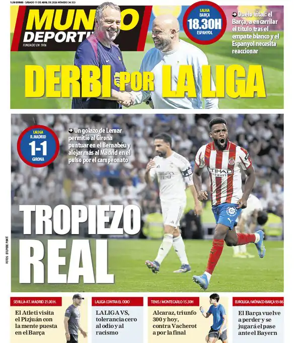 ركزت الصحيفة على تعادل ريال مدريد أمام جيرونا (1-1) في الدوري الإسباني وابتعاده في صراع اللقب، وكتبت: "ميونخ أو لا شيء".
