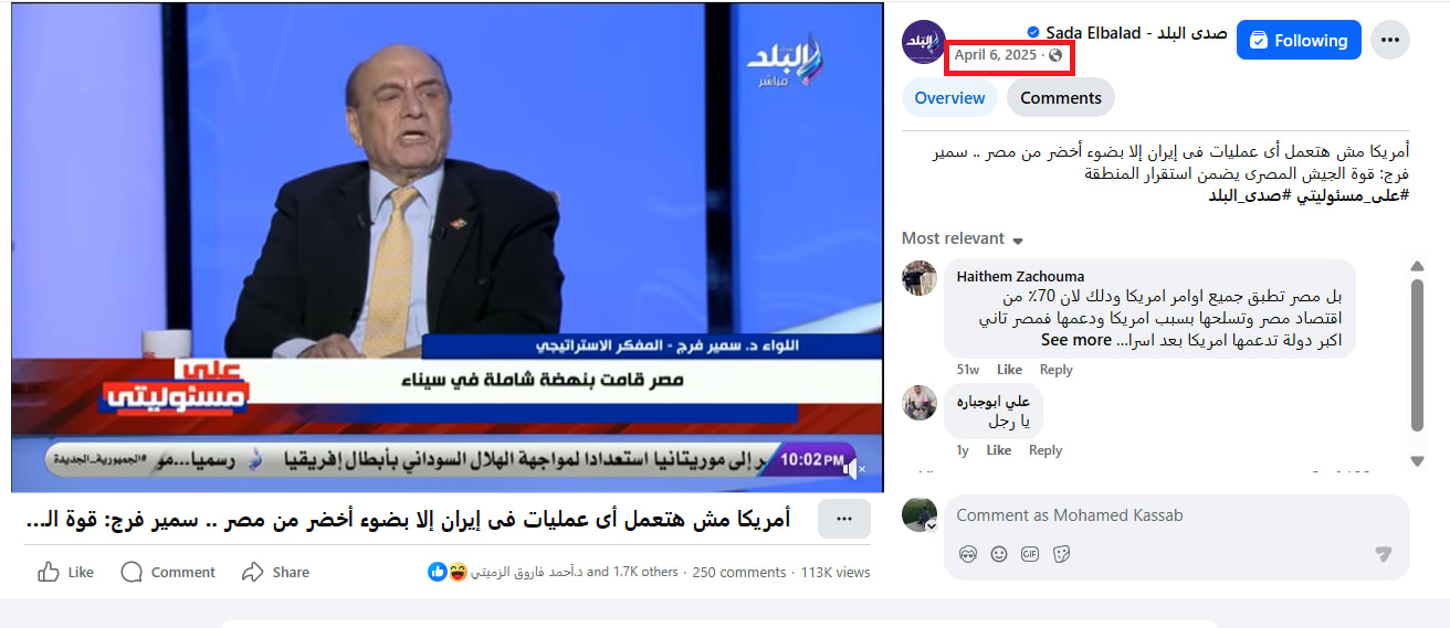 باستخدام البحث العكسي، تبين أن الخبير المصري سمير فرج أدلى بهذه التصريحات في أبريل/نيسان 2025، عندما ظهر مع الإعلامي أحمد موسى ببرنامج "على مسؤوليتي" المُذاع عبر فضائية "صدى البلد" المصري.