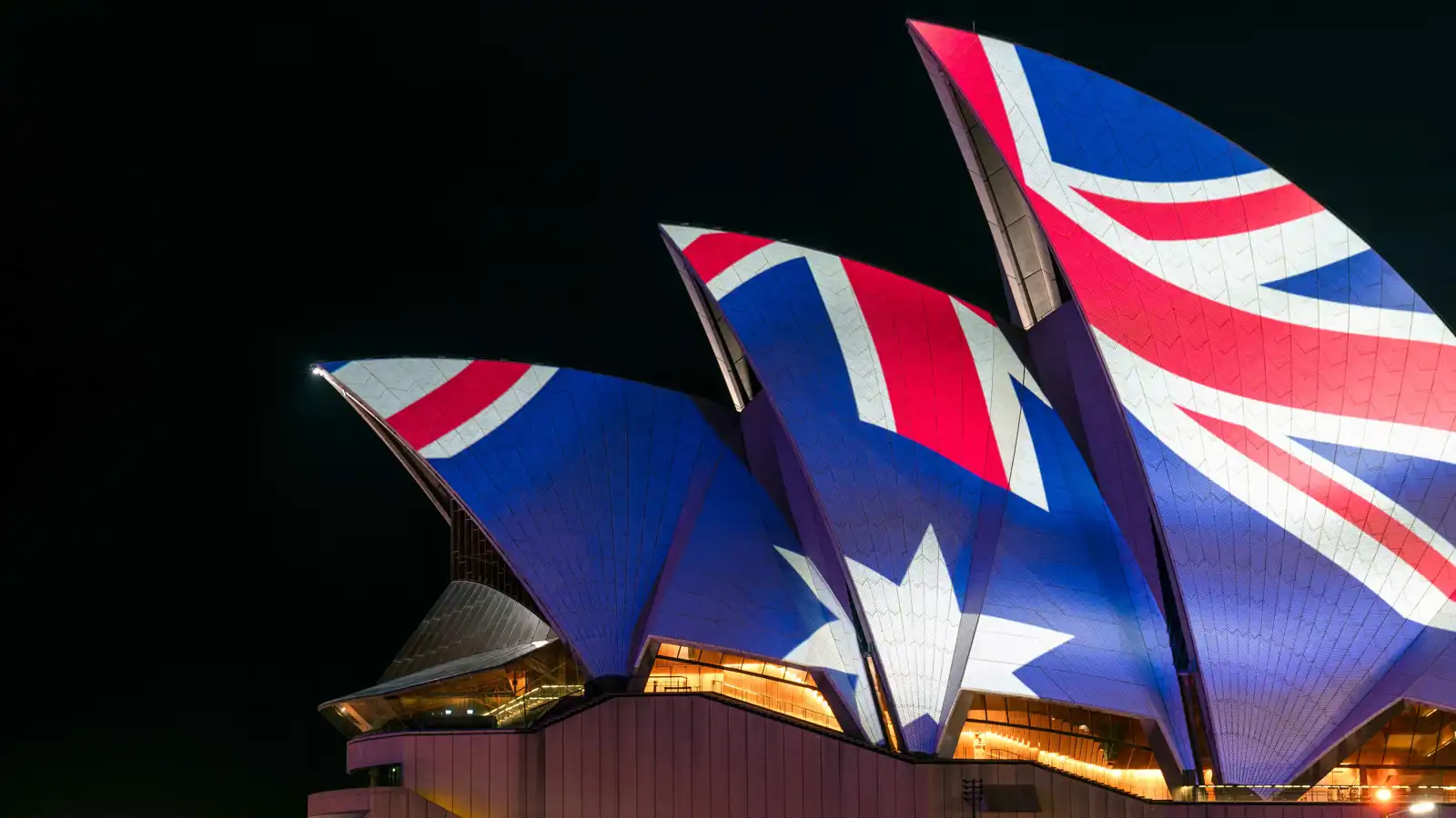 العلم الأسترالي على دار أوبرا سيدني خلال احتفالات يوم أستراليا في سيدني، أستراليا، في 26 يناير 2026.
