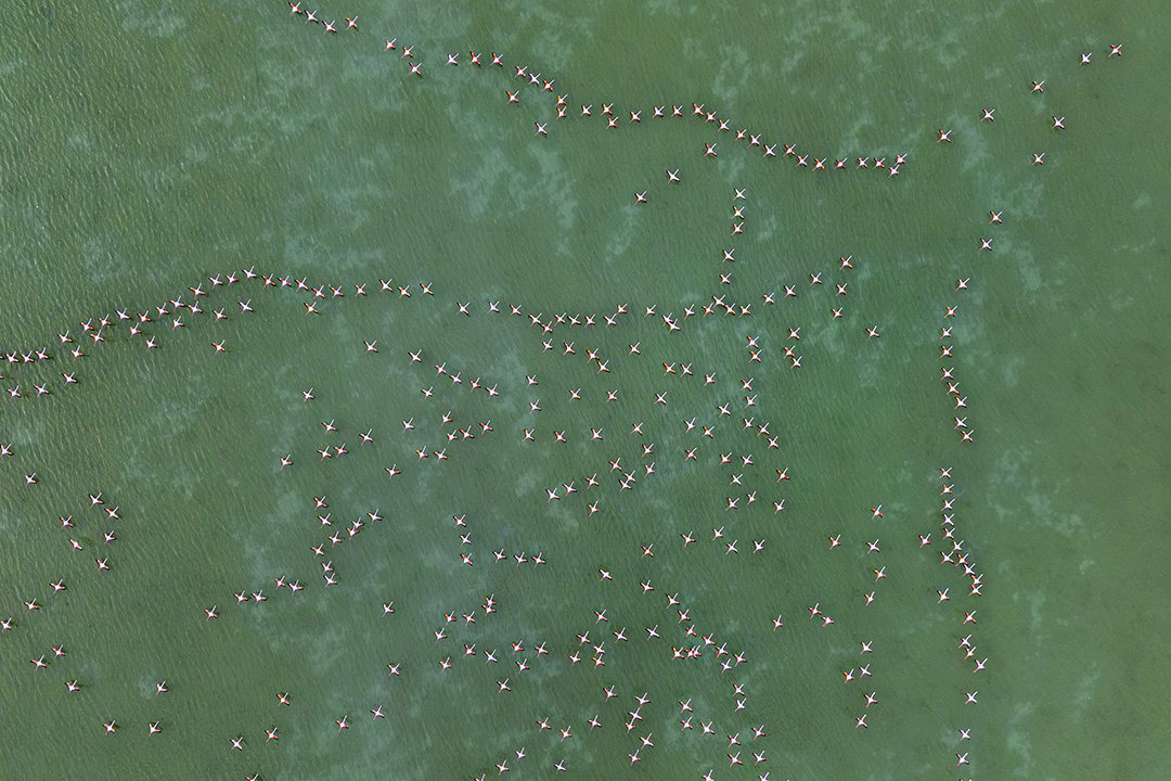 في مجموعة من الصور الآسرة التي وثّقها المصور التركي باستخدام طائرة "درون"، تتناثر طيور الفلامنجو عبر هذه الأراضي الرطبة.
