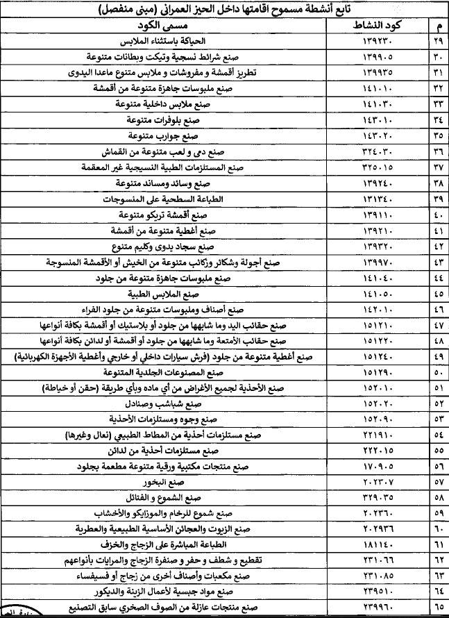 كما تُستثنى الأنشطة الصناعية خارج الأحوزة العمرانية التي تتطلب بحسب طبيعتها والمقومات اللازمة لتشغيلها التواجد خارج الحيز العمراني بشرط موافقة الجهة الإدارية المختصة وتوافر الاشتراطات اللازمة لممارسة النشاط الصناعي، وذلك وفقا لما تحدده الهيئة العامة للتنمية الصناعية، كما يحظر القرار إقامة أو إدارة أو تشغيل أي من الأنشطة الصناعية المدرجة بالملحق رقم ۲ المرفق بهذا القرار داخل المناطق الصناعية.