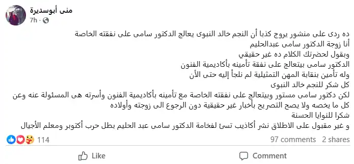 رد زوجة الفنان سامي عبد الحليم حول تكفل خالد النبوي بعلاجه في منشور لها عبر حسابها الرسمي في منصة "فيس بوك"، نفت منى أبو سديرة أنباء تكفل الفنان خالد النبوي بعلاج زوجها بشكل قاطع، قائلة: ده ردي على منشور يروج كذبًا إن النجم خالد النبوي يعالج الدكتور سامي على نفقته الخاصة.