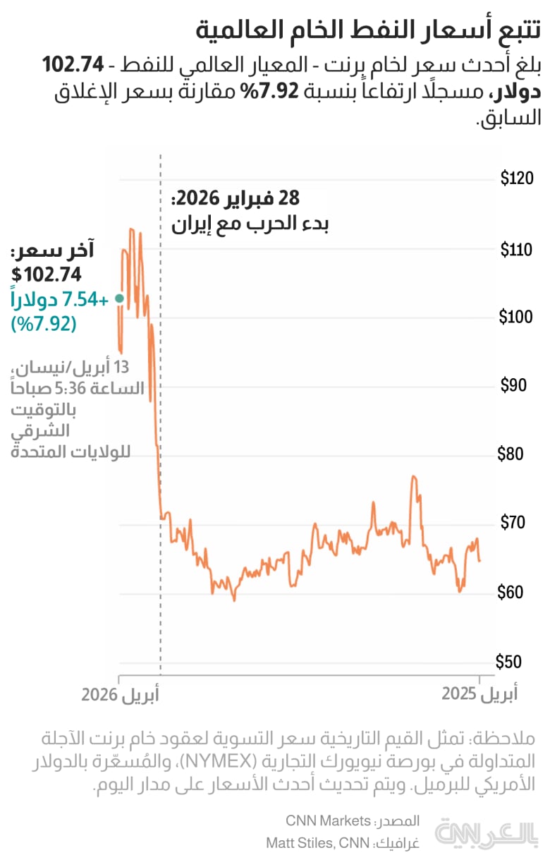 وسط الصراع مع إيران.. كيف تطوّرت أسعار النفط عالميًا والوقود في أمريكا؟ (CNN)-- ارتفعت أسعار النفط العالمية بشكل ملحوظ خلال فترة الحرب التي دارت بين الولايات المتحدة وإسرائيل من جهة، وإيران من جهة أخرى. وفي ظل سريان هدنة هشة تستمر لمدة أسبوعين، تتجه الأنظار كافة نحو الخطة الإيرانية لإعادة فتح مضيق هرمز؛ ذلك الممر المائي الحيوي لنقل النفط الخام إلى بقية أنحاء العالم. وقد حذر الخبراء من توقع عودة فورية لحركة الملاحة البحرية إلى وضعها الطبيعي.