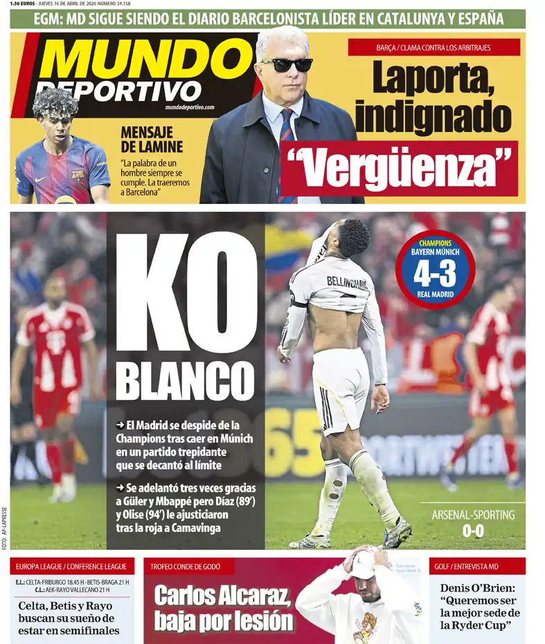 ركزت الصحيفة على إقصاء ريال مدريد من ربع نهائي دوري أبطال أوروبا بعد الخسارة أمام بايرن ميونخ، والجدل التحكيمي عقب طرد كامافينغا، وكتبت: "يا له من ظلم".
