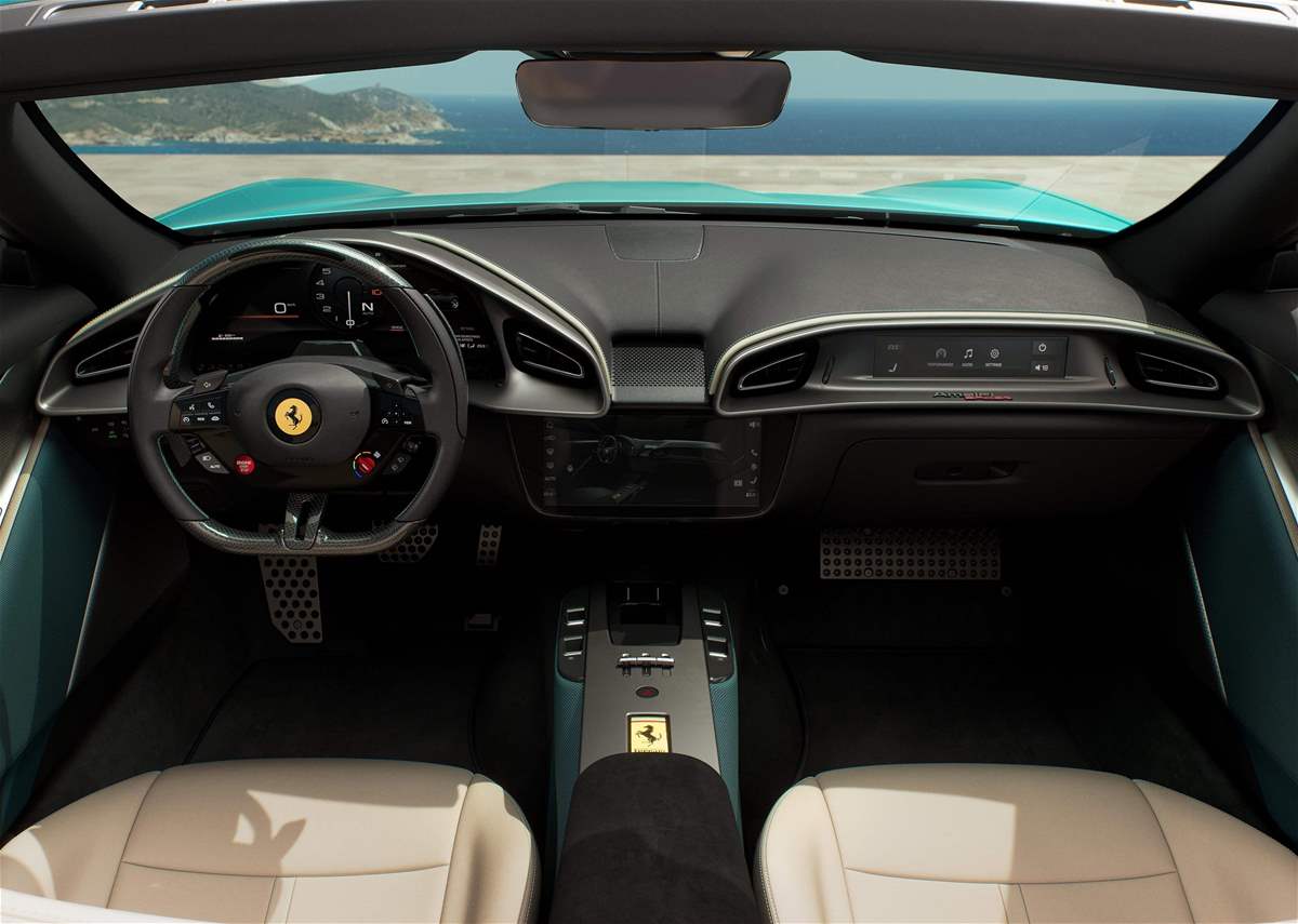 تعتمد المقصورة فلسفة Dual Cockpit التي تفصل بصرياً بين السائق والراكب، مع ثلاث شاشات رقمية وتجربة اتصال حديثة. كما يعكس التصميم البسيط وجودة المواد هوية فيراري المعاصرة. لكن المقاعد الخلفية في تكوين 2+2 تبقى محدودة الفائدة عملياً وتخدم الجانب التسويقي أكثر من الاستخدام الحقيقي.