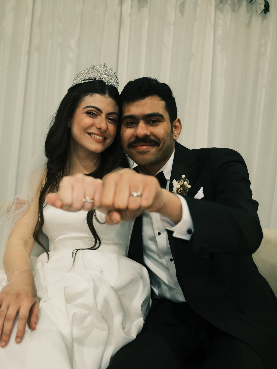 الفستان جاء من الساتان الفاخر الذي منح التصميم لمعة راقية، وتزيّن بالدانتيل المطرز بدقة على الصدر والأكمام الطويلة ليعكس طابعًا ملكيًا يليق بالأميرات. القصة الرفيعة عند العنق أضفت لمسة كلاسيكية أنيقة، فيما انسابت الأكمام الطويلة والمزدانة بالدانتيل لتبرز أنوثة رقيقة. الطرحة الطويلة المصنوعة من التول الشفاف والمزيّنة بتطريزات ناعمة على الأطراف أكملت المشهد العرائسي الفخم، لتتناغم مع الفستان وتؤكد حضورًا ملكيًا متكاملًا.
