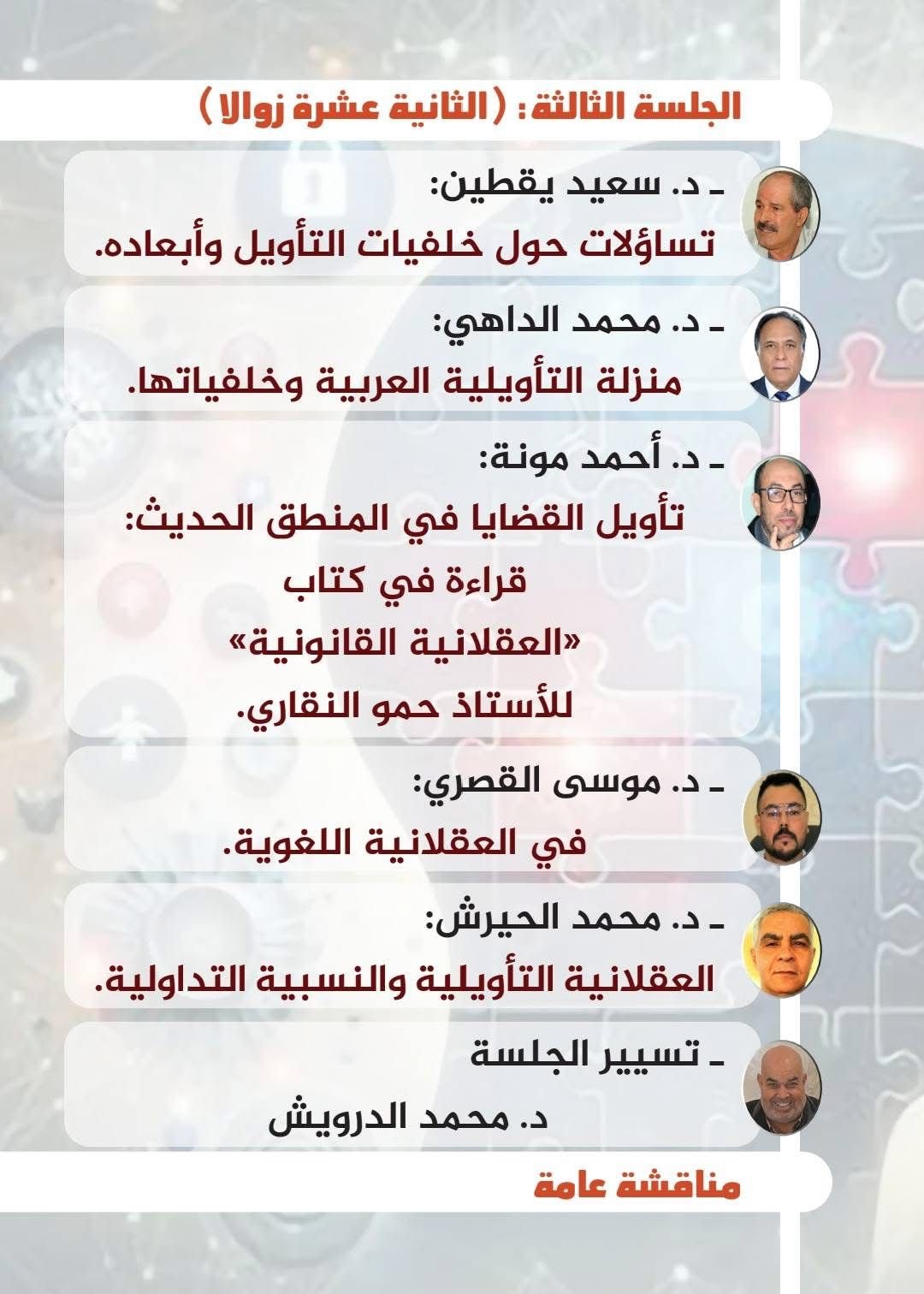 كما يسلط الأستاذ موسى القصري الضوء على أبعاد العقلانية اللغوية، ويبحث الدكتور محمد الحيرش في تقاطعات العقلانية التأويلية والنسبية التداولية، قبل أن تُختتم الأشغال بنقاش عام يفتح المجال لتفاعل علمي يعزز من غنى هذا اللقاء.