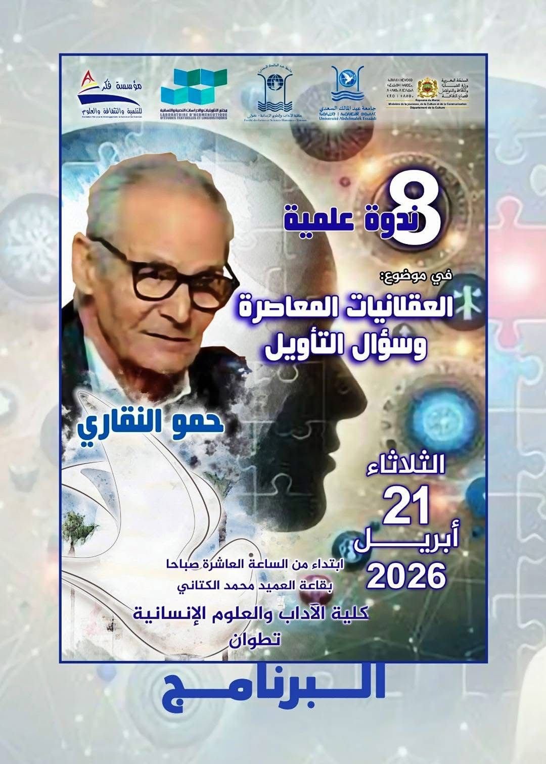 تحتضن مدينة تطوان، يوم الثلاثاء 21 أبريل الجاري، حركية فكرية متميزة من خلال ندوة علمية تكريمية ثامنة تنظمها مؤسسة فكر للتنمية والثقافة والعلوم وذلك احتفاء هذه المرة بالدكتور حمو النقاري في موضوع العقلانيات المعاصرة وسؤال التأويل ، ابتداء من الساعة العاشرة صباحا بقاعة العميد محمد الكتاني بكلية الآداب والعلوم الإنسانية.