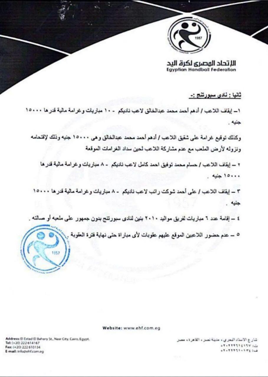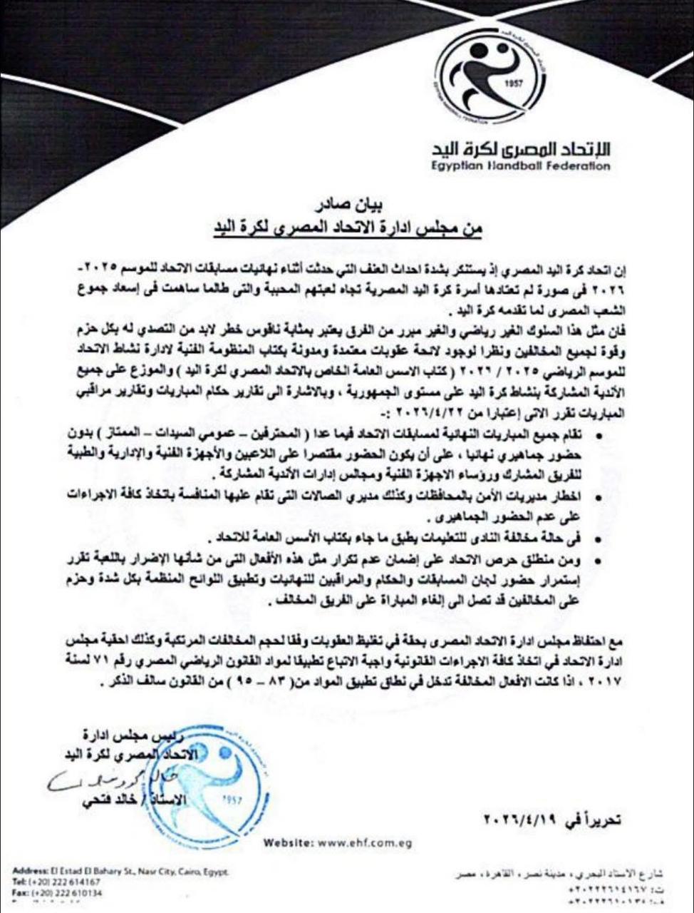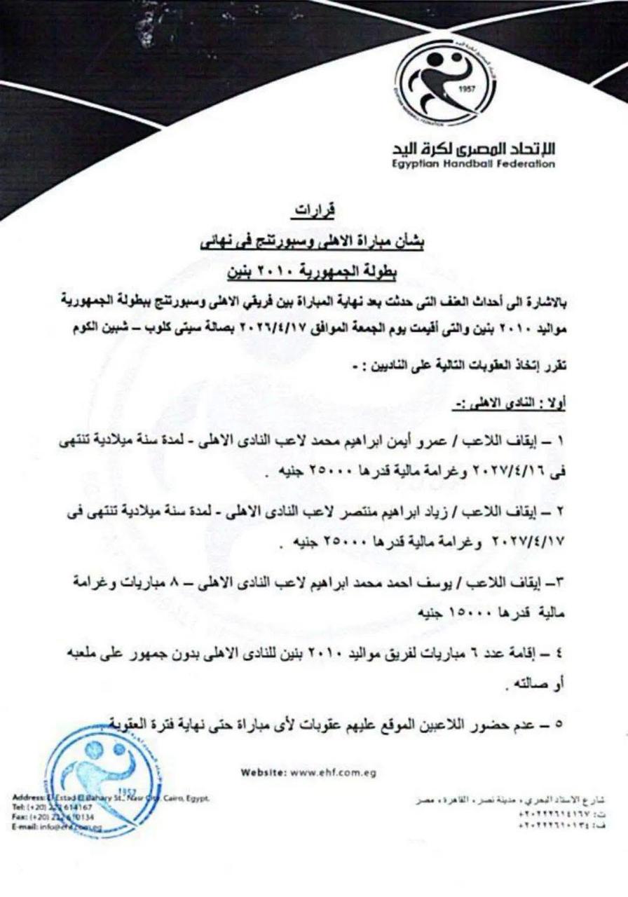 أصدر إتحاد كرة اليد برئاسة خالد فتحي، قرارات رسمية بشأن أحداث مباراة الأهلي وسبورتنج في نهائي بطولة الجمهورية مواليد 2010 بنين، والتي أُقيمت يوم الجمعة الموافق 17 أبريل 2026 بصالة سيتي كلوب بشبين الكوم، وذلك عقب ما شهدته من أحداث شغب بعد نهاية اللقاء.