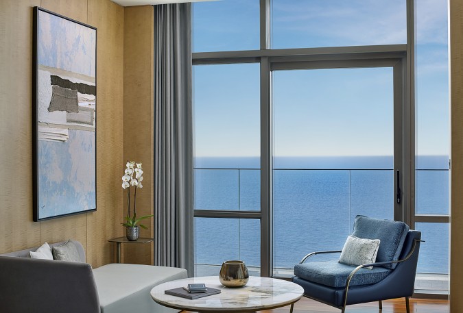 يضم الفندق 221 غرفة وجناحاً وشقة فندقية فاخرة، تتميز جميعها بإضاءة طبيعية، وشرفات خاصة، ونوافذ ممتدة من الأرض حتى السقف؛ ما يتيح للضيوف الاستمتاع بإطلالات ساحرة على البحر، ضمن تصاميم داخلية مستوحاة من ألوان السماء والمياه والرمال.