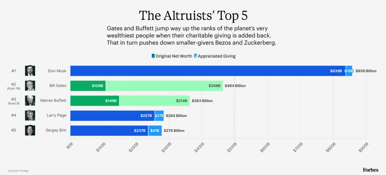 فوربس تعيد رسم خريطة أثرياء العالم بعد احتساب تبرعاتهم الخيرية، إيلون ماسك يتصدر بثروة تُقدَّر بنحو 858 مليار دولار، و بيل غيتس يرتفع من المركز 19 إلى الثاني، و وارن بافيت يدخل نادي الخمسة الكبار