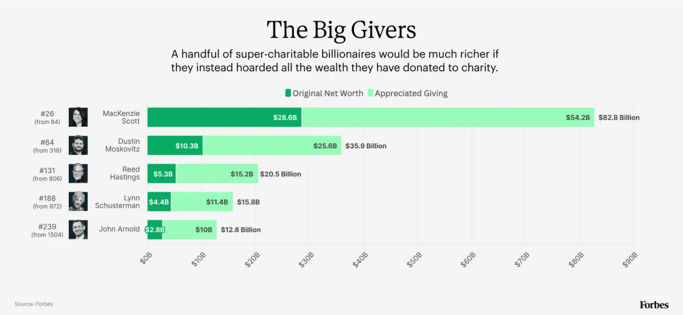 يثير هذا التفاوت تساؤلًا مهمًا حول الشكل الذي كانت ستبدو عليه قائمة أثرياء العالم لو أن أكثرهم سخاءً، مثل وارن بافيت الذي تبرع بأكثر من نصف أسهمه في شركة بيركشاير هاثاواي، وبيل غيتس الذي حوّل مع زوجته السابقة ميليندا فرينش غيتس أكثر من 60 مليار دولار إلى مؤسسة غيتس، لم يقدموا أي تبرعات خيرية.