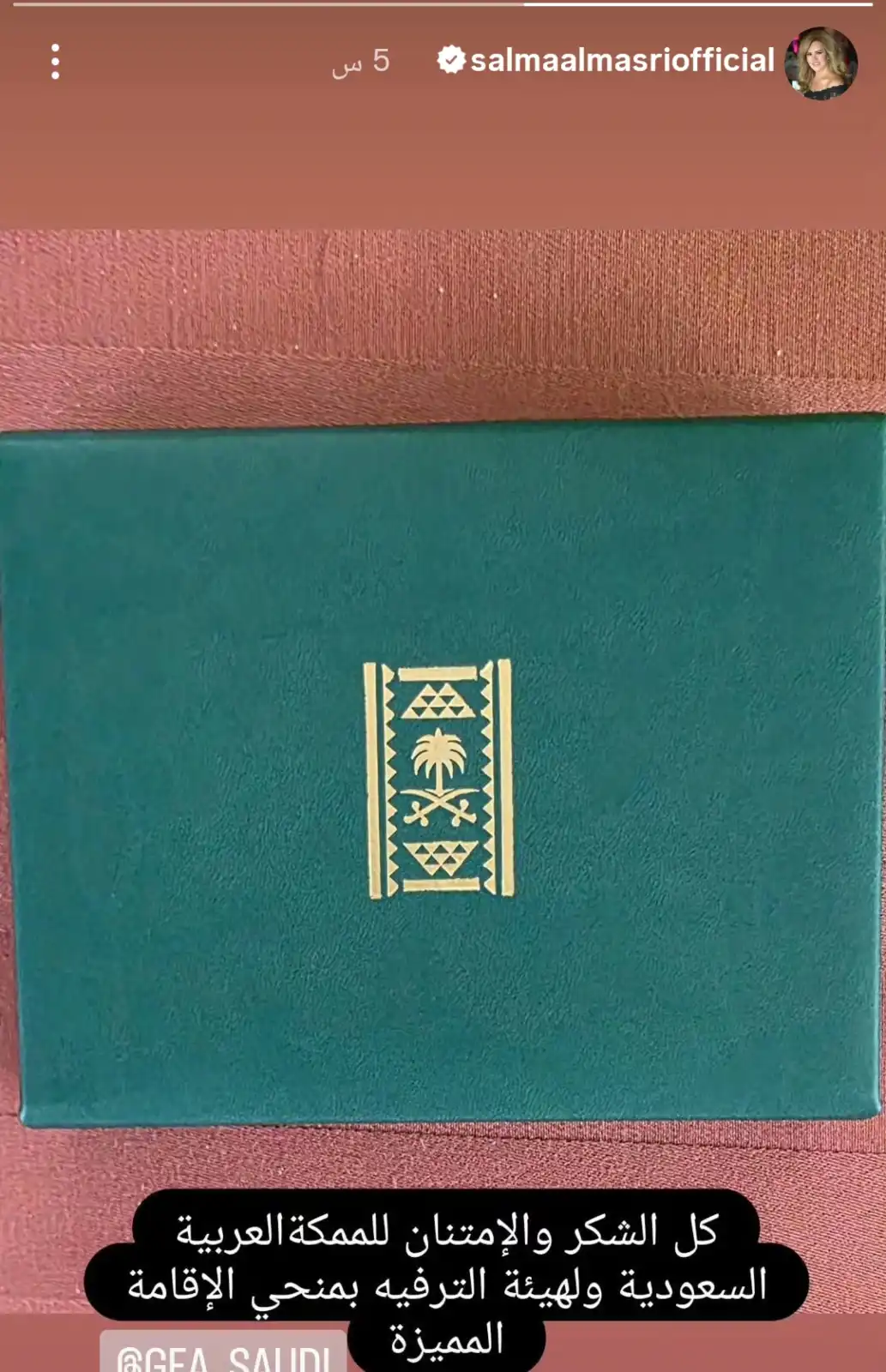 سلمى المصري تشكر السعودية على منحها الإقامة المميزة عبّرت سلمى المصري عن سعادتها بهذا التكريم، ونشرت عبر خاصية "الستوري" على "إنستغرام صورة لعلبة فاخرة تحمل شعار المملكة، وأرفقتها برسالة شكر وجهتها إلى الهيئة العامة للترفيه، مؤكدة تقديرها لهذه المبادرة التي تعكس اهتمام السعودية بالمبدعين العرب، كما خصّت بالشكر رئيس الهيئة المستشار تركي آل الشيخ، مشيدةً بالدور الذي تلعبه المملكة في دعم القطاع الثقافي والفني.