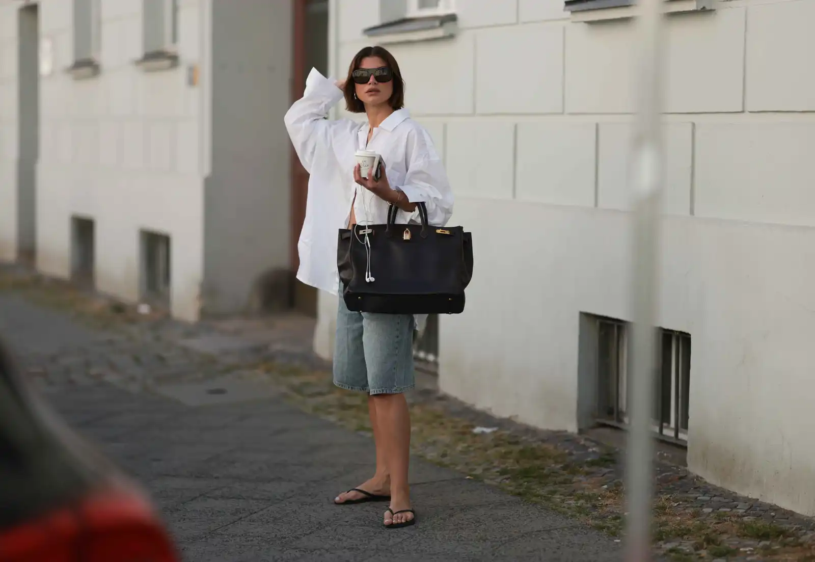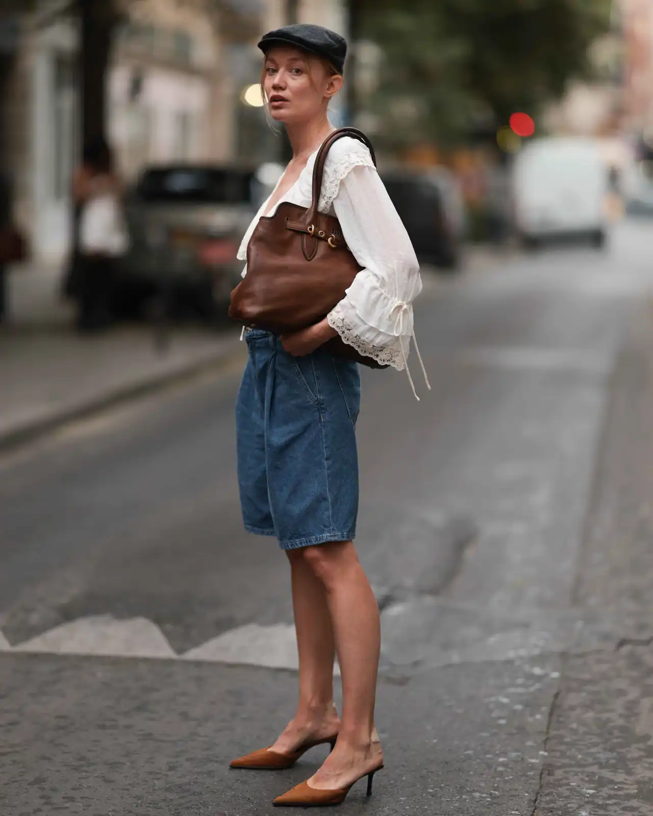 شورت البرمودا بأسلوب أنثوي أنيق إذا كنتِ من محبّات الإطلالات الأنثوية الجريئة، اختاري برمودا قطني بنقشة تمنحه طابعاً أقرب إلى الأسلوب الرسمي، مثل الغينغهام، ونسّقيه مع قميص أبيض بقصّة كلاسيكية. أضيفي جاكيت جلد قصير فوق القميص لإضفاء لمسة جريئة تعزّز طابع الإطلالة، ونسّقيه مع حذاء بكعب عالٍ باللون الأسود. يمكنكِ إضافة جوارب لإبراز اللوك بأسلوب أكثر حدّة وعصرية.