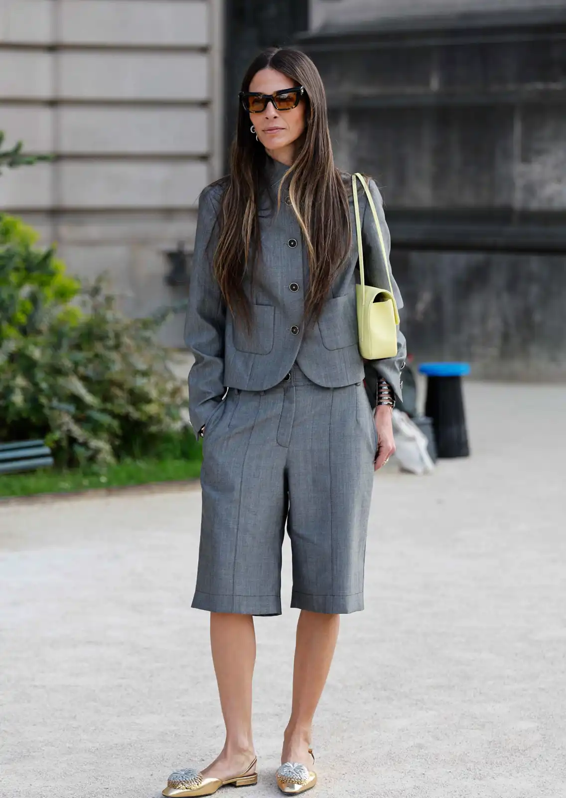 طقم مناسب للمكتب تُعد البدلات النسائية من أبرز تنسيقات هذا العام بمختلف قصّاتها، خاصة الطقم المكوّن من شورت البرمودا والبليزر، الذي يليق بالإطلالات المكتبية شبه الرسمية. يمكنكِ تنسيق البليزر مع قميص أو تيشيرت باللون الأبيض أو الأسود، خصوصاً في الأجواء الأكثر دفئاً. استوحي من هذا اللوك لإطلالة متوازنة تجمع بين العملية والأناقة، وأكملي التنسيق بحذاء باليرينا بلون لافت مثل الذهبي لإضافة لمسة عصرية.