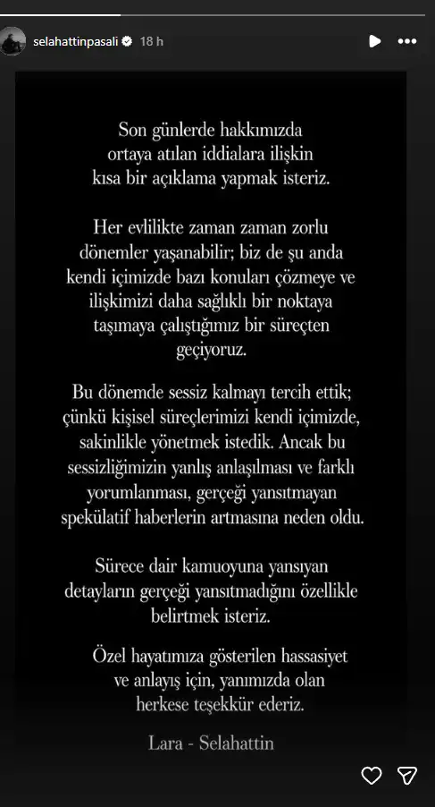 أصدر النجم التركي صلاح الدين باشالي وزوجته لارا باشالي بيانًا مشتركًا وضع حدًا للتكهنات المتزايدة حول طبيعة علاقتهما، بعد انتشار شائعات عن انفصال وخيانة مزعومة.