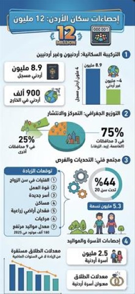 'الأعلى للسكان': 12 مليون نسمة سكان المملكة و44% منهم دون الـ 20 عاما