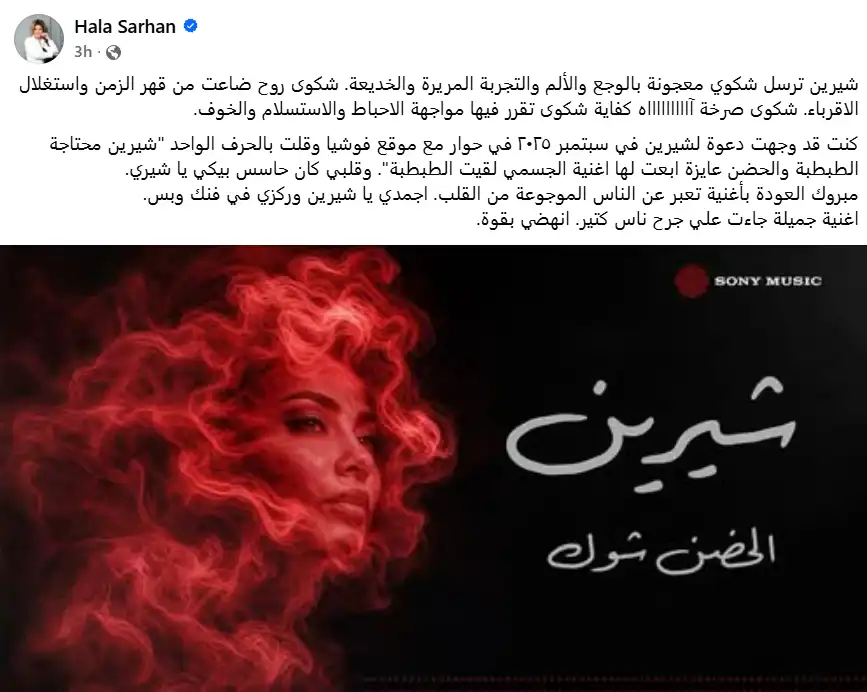 في لفتة إنسانية لاقت تفاعلاً واسعاً من الجمهور، وجّهت الإعلامية المصرية هالة سرحان رسالة دعم مؤثرة إلى النجمة شيرين عبد الوهاب، عقب عودتها إلى الساحة الغنائية من خلال أغنيتها الجديدة "الحضن شوك"، والتي حظيت بإعجاب واسع من الجمهور.