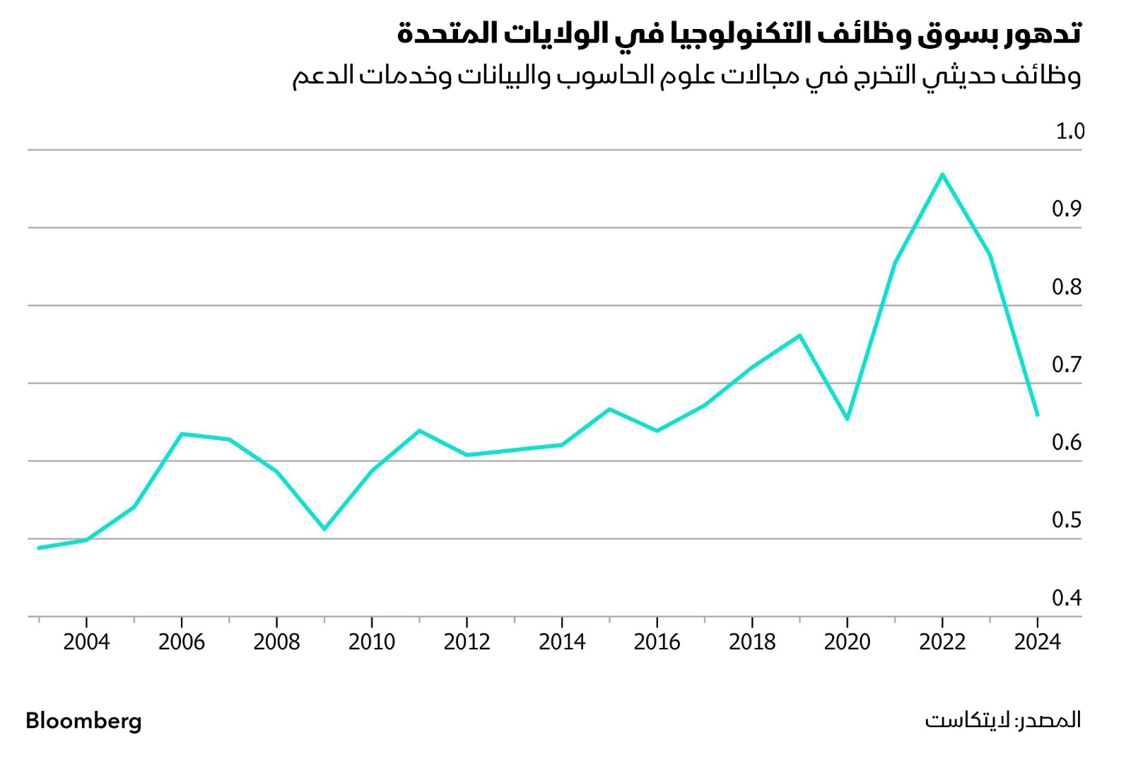 ويزداد الوضع سوءاً بسبب عدم توافق ما يدرسه الطلاب مع المجالات التي يخلق فيها الاقتصاد وظائف. والنتيجة: في 22 من أصل 35 تخصصاً، تراجعت نسبة الوظائف المبتدئة المتاحة لكل خريج خلال العقدين الماضيين، وفق تحليل أجرته "بلومبرغ" لبيانات "لايتكاست".