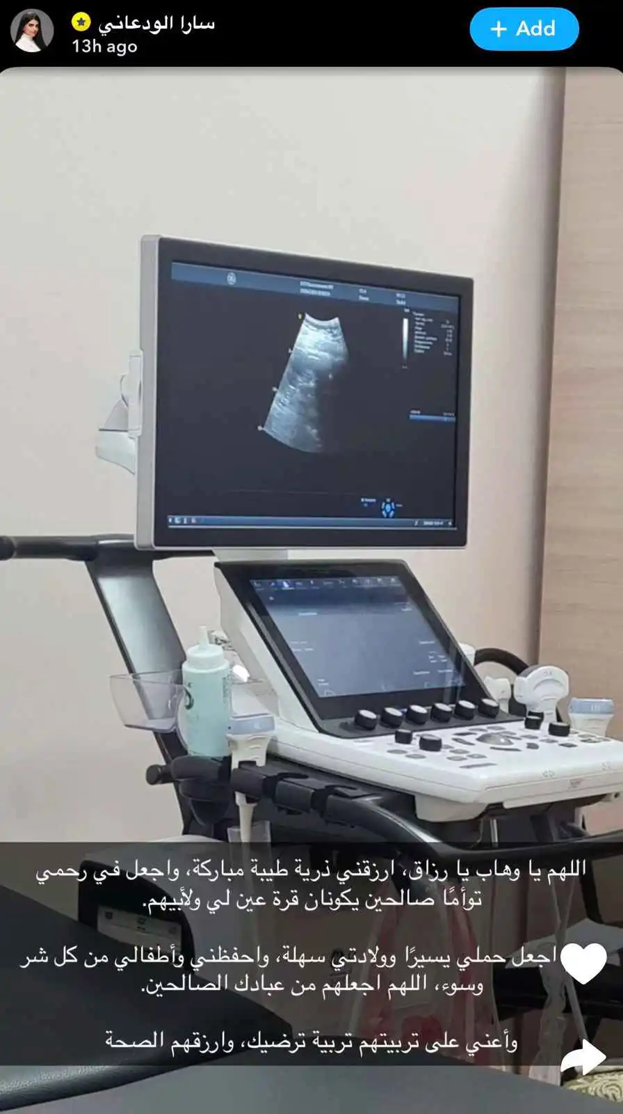 سارة الودعاني تثير الجدل حول حملها بتوأم تفاعل الجمهور بشكل واسع مع صورة السونار التي نشرتها سارة الودعاني وتعليقها عليها، والذي تضمن دعاءً اعتبره البعض تلميحًا لاحتمال حملها بتوأم، حيث قالت: اللهم يا وهّاب يا رزّاق، ارزقني ذرية طيبة مباركة، واجعل في رحمي توأمًا صالحَين يكونان قرة عين لي ولأبيهما.