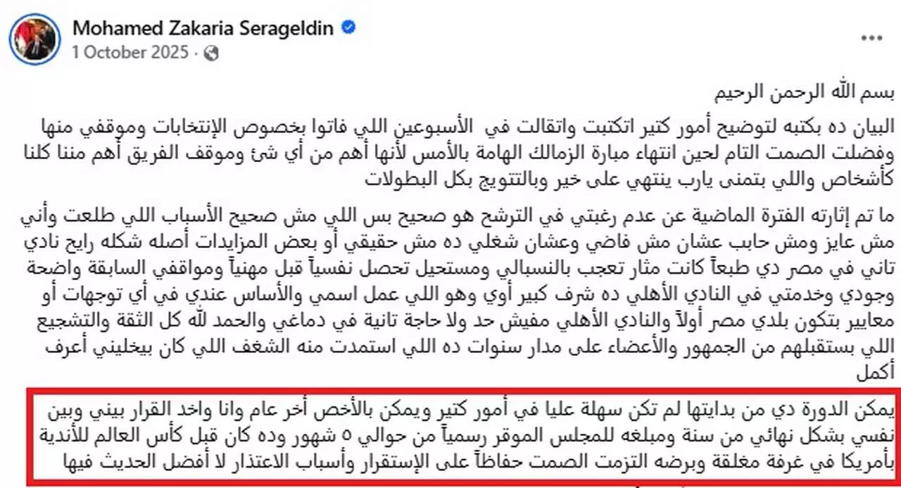 وكانت لهاني رمزي، رئيس لجنة الاسكاوتنج، شهادة قريبة حول الانفراد بالقرار، خلال بودكاست في مارس الماضي، إذ قال: "العملية في النادي الأهلي ما تعرفش مين فين، فيه مناصب كتير بدون صلاحيات ودون تخصص، القرار عند الكابتن الخطيب في كل حاجة".