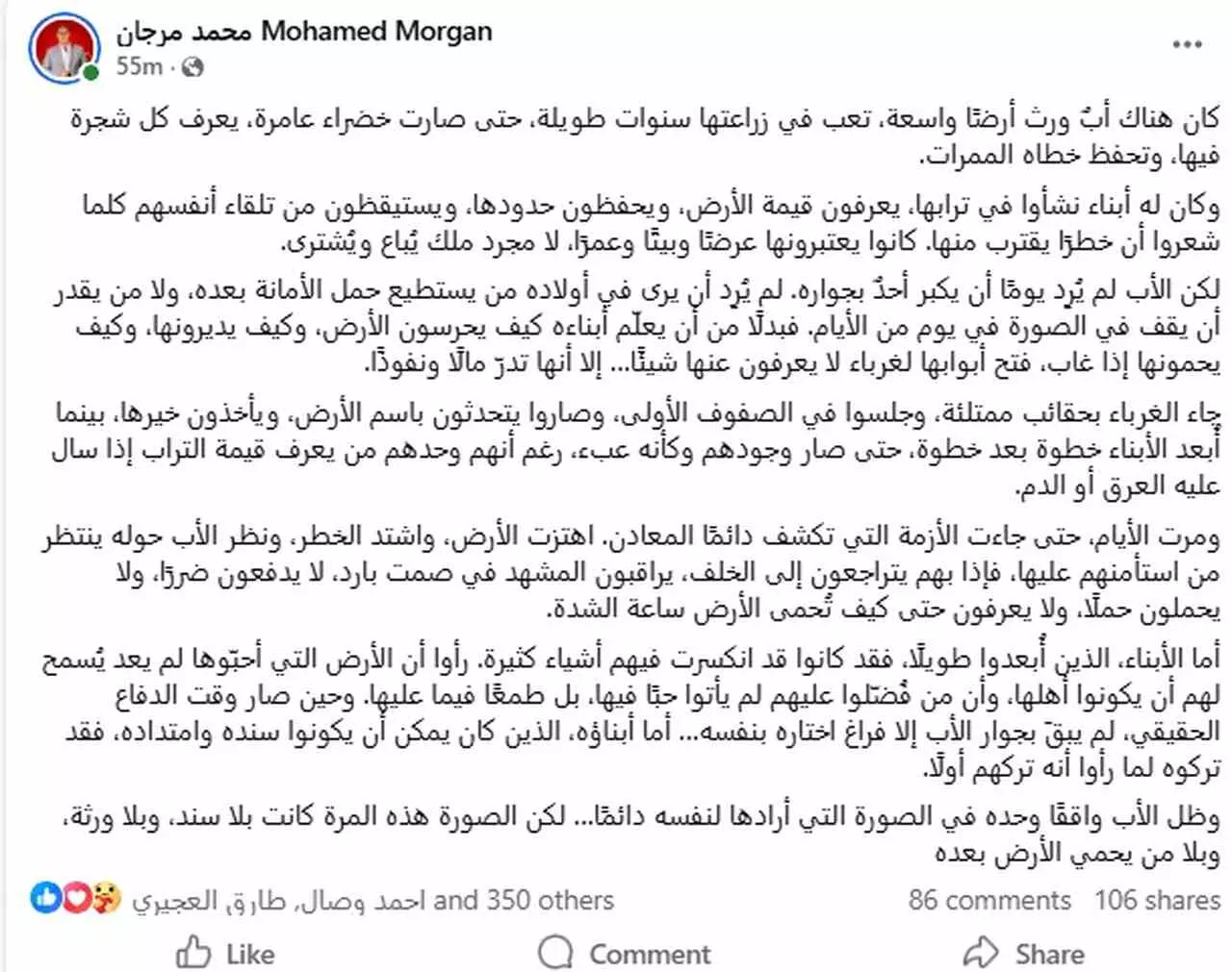 وقال مرجان: "الأب لم يُرِد يومًا أن يكبر أحدٌ بجواره. لم يُرِد أن يرى في أولاده من يستطيع حمل الأمانة بعده، فتح أبوابها لغرباء لا يعرفون عنها شيئًا إلا أنها تدرّ مالًا ونفوذًا".