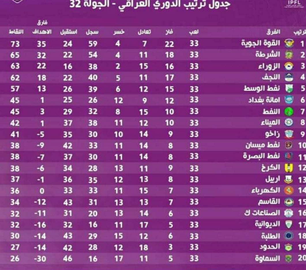 جدول ترتيب فرق الدوري العراقي الممتاز بعد نهاية الجولة 33. #العراق